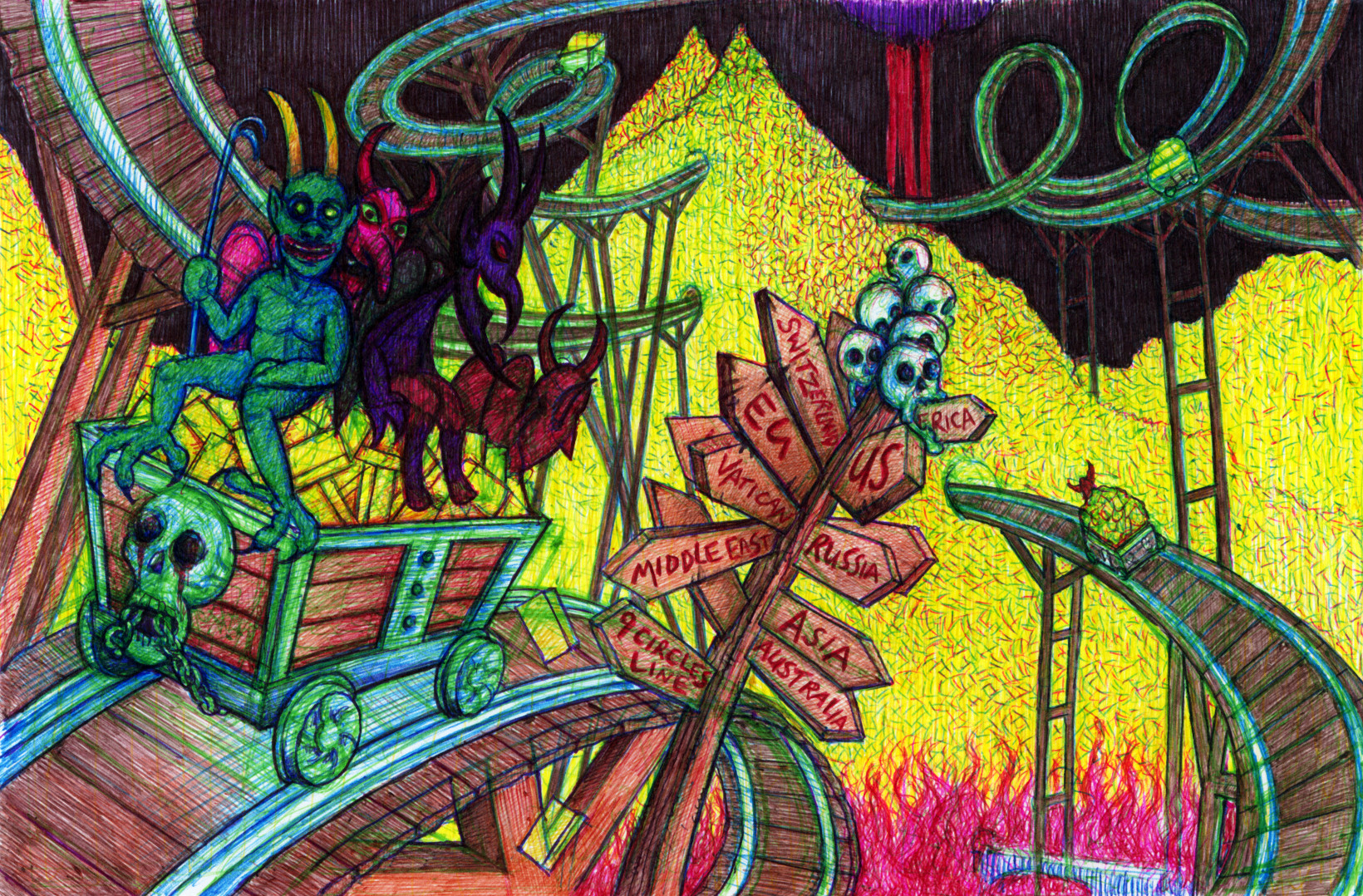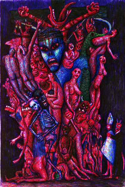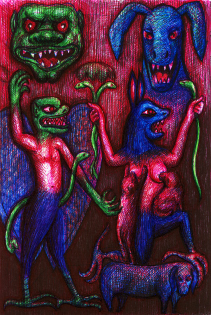The two images above are part of an eight part series, LoveHate and PowerTrip – biro on A4 paper