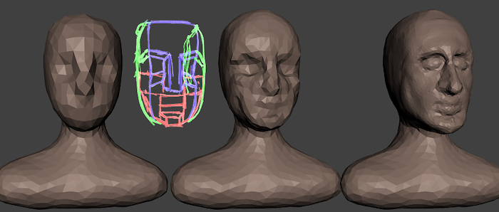 My first ever quick 45 minute sculpt using Caesar's marble portrait as reference. Not very good - not happy. Need to focus on just the basic structures under the face, which I did through my own study in the second image with the grease pencil red, blue and green guidelines. Next I will be using theory and rules with my own analysis to construct the face.