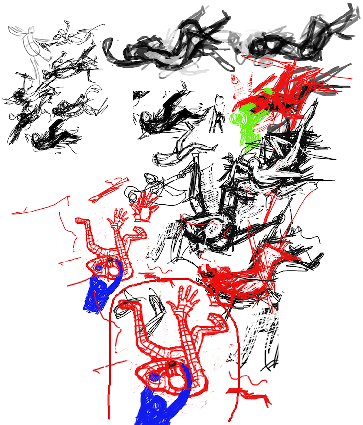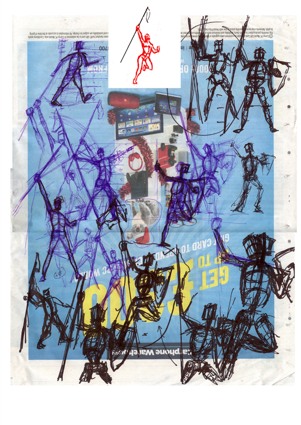 Drawing Exercise 2 – looking at another pose of Joan of Arc being pulled off her horse. Drawing Exercise 3, drawn on the back of Metro newspaper with sharpie and biro – pushing the Joan of Arc running pose in exercise 2 to the two poses in 3rd image (like animation)