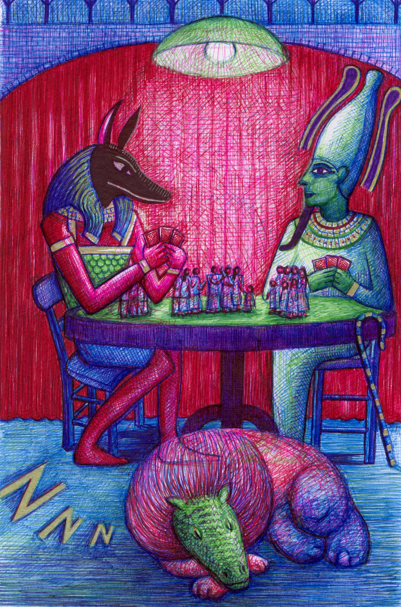 Deep in the underworld Osiris and Anubis playing poker with people's souls and Ammit sleeping. Idea and image flashed in my mind part of a future animation. (Bic biro on paper)